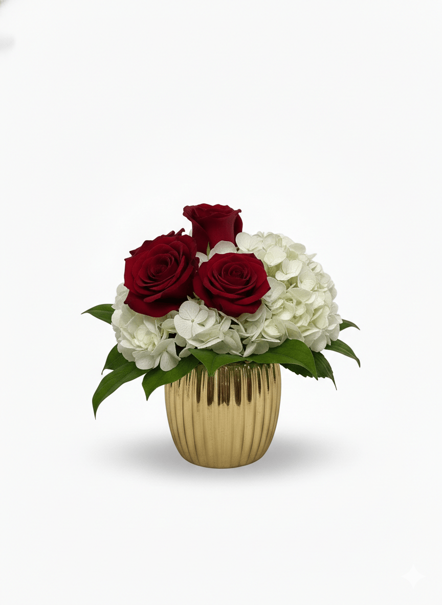 Give them the gold standard with 24K, a luxurious yet affordable romantic arrangement. This elegant design features pristine white hydrangea paired with three premium red roses and fresh lemon leaf greenery. The contrast of pure white and passionate red creates sophisticated romance with a modern twist. The substantial hydrangea bloom provides impressive visual impact while the roses add classic romantic symbolism. Perfect for Valentine's Day, anniversaries, or showing someone they're worth their weight in gold without breaking the bank.