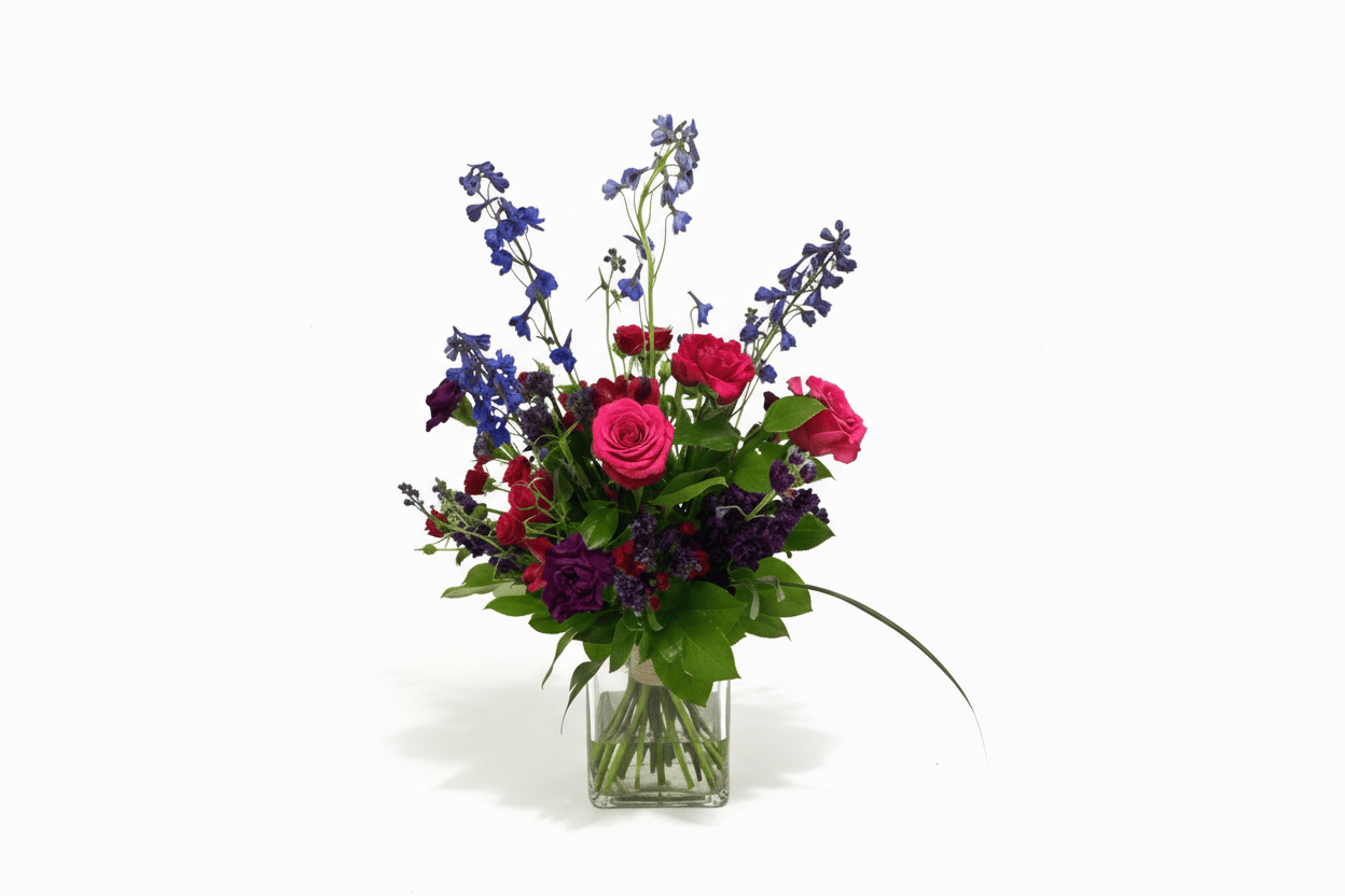 Captivate the senses with Endless Passion, a dramatic arrangement of jewel-toned blooms in rich emerald, sapphire, ruby, and amethyst hues. This modern design features deep red roses, purple carnations, striking blue delphinium, and vibrant alstroemeria in saturated colors that command attention. The sophisticated color palette creates depth and intrigue, perfect for those who appreciate bold, contemporary style. Presented in a sleek dark cinch-style or fluted vase that complements the rich tones.