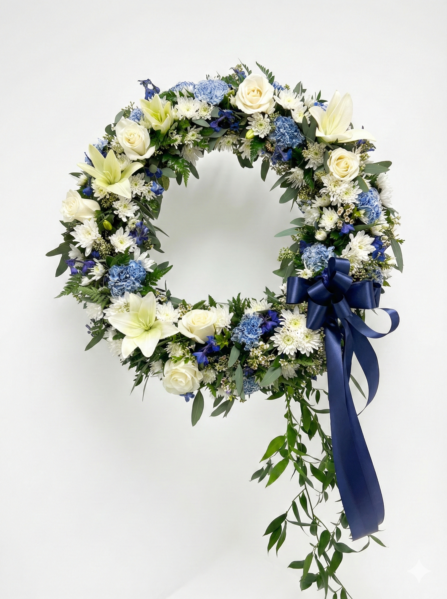 Create an enduring circle of love with Never Forgotten, a classic wreath arrangement symbolizing eternal life. This traditional sympathy piece can feature mixed seasonal blooms including carnations, mums, stock, and daisies, or upgrade to premium roses and lilies. Select your color palette to personalize this meaningful tribute. Available in small, medium, and large sizes. Includes wreath oasis form and easel for service display. The circular shape represents the unending nature of cherished memories and love that transcends loss.