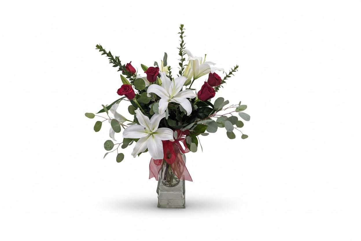 Make a stunning statement with The Star Gazer, a dramatic arrangement pairing classic red roses with magnificent Oriental lilies. The loose, airy design creates natural movement while showcasing the bold beauty of stargazer or white Oriental lilies surrounded by premium red roses. This romantic combination offers both elegance and drama, with the lilies' intoxicating fragrance enhancing the experience. Presented in a tall clear glass vase that allows the stems to shine. Available with your choice of pink, red, or white lilies. Perfect for romance, celebrations, or making any moment extraordinary.