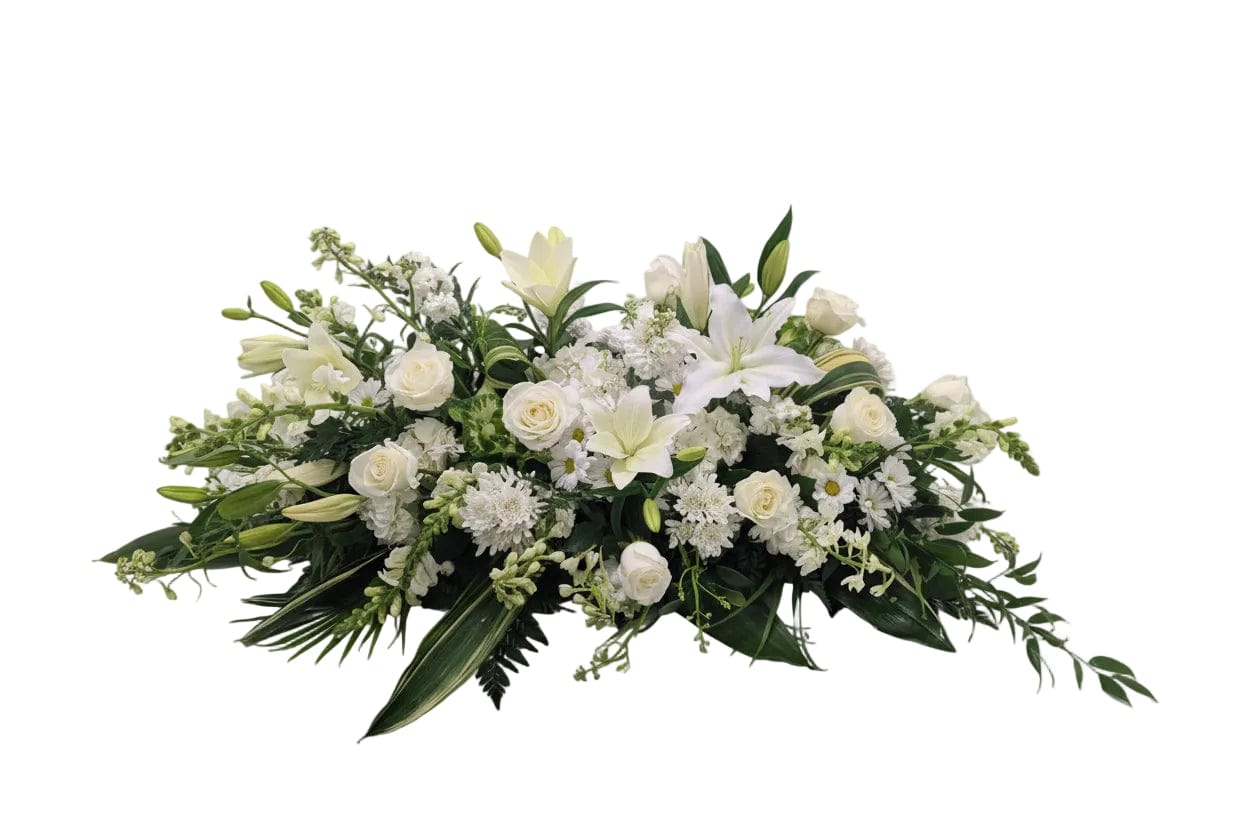 Create a magnificent final tribute with Thoughtful Memories, a full casket spray in your personalized color palette. This impressive piece can be designed with mixed seasonal blooms including carnations, mums, stock, and daisies, or exclusively with premium roses and lilies for ultimate elegance. Available in small, medium, and large sizes to cover partial or full casket. Displayed on a black or white tall plastic pedestal. The casket spray serves as the central floral focal point at funeral services, honoring their legacy with abundant beauty.